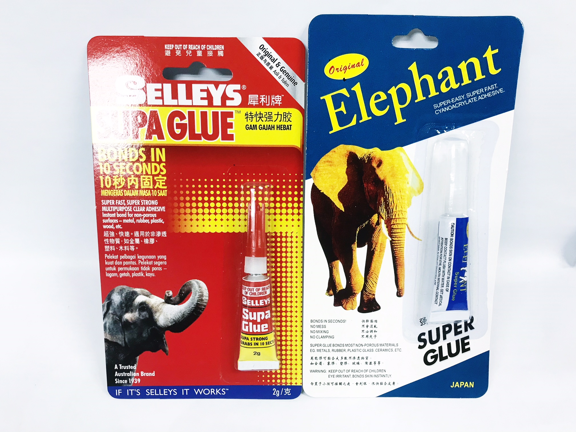 Selleys Super Glue, Elephant Super Glue bond in seconds are available in a card of 1’s or 2’s.